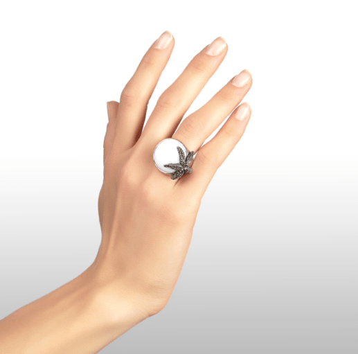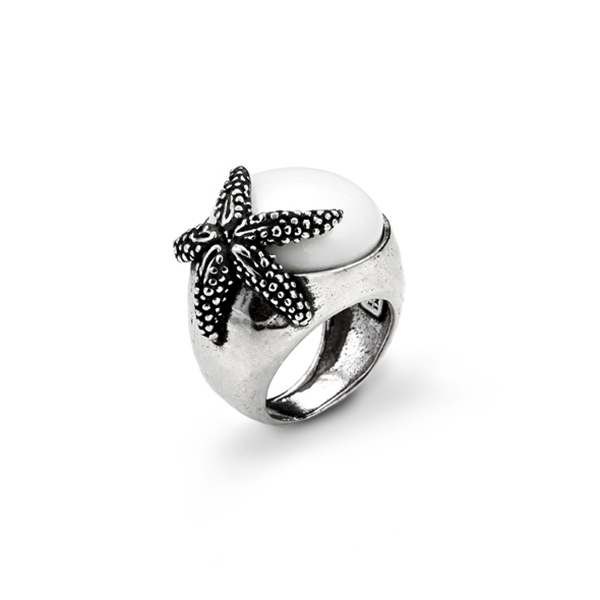 Anello argento 925/°°° della collezione Stelle Marine con Agata bianca. Peso 19 grammi. Realizzato a mano in Italia. Referenza 07223