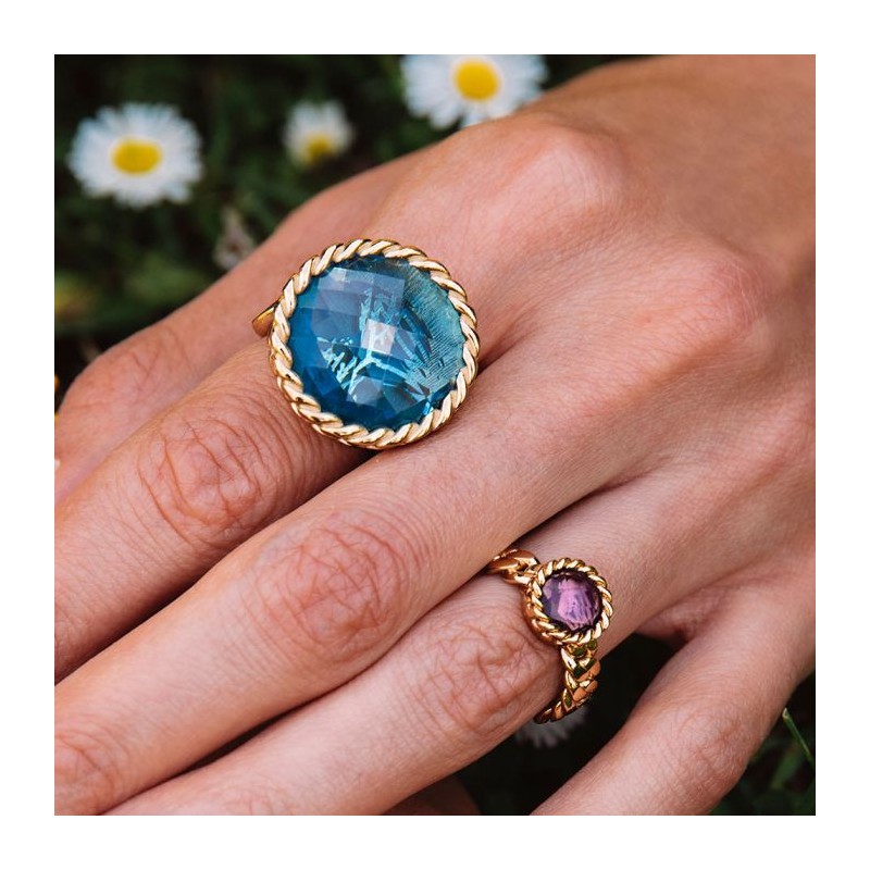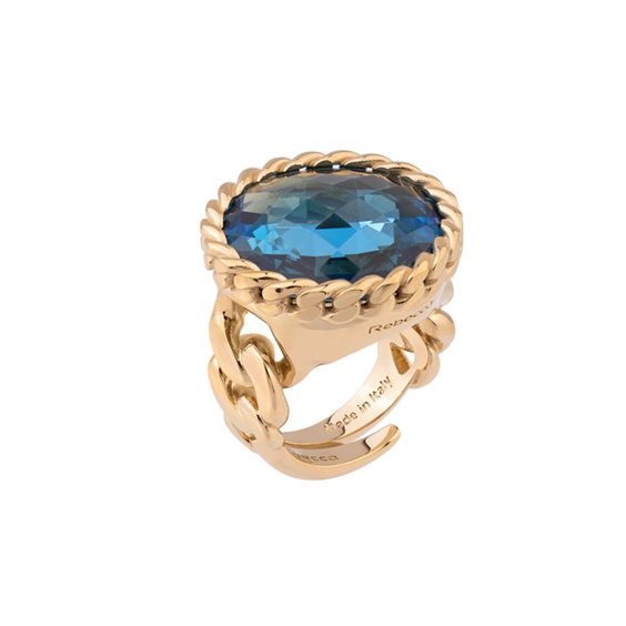 Anello della collezione Cocktail in bronzo placcato oro 24kt. Con pietra azzurra. Misura regolabile