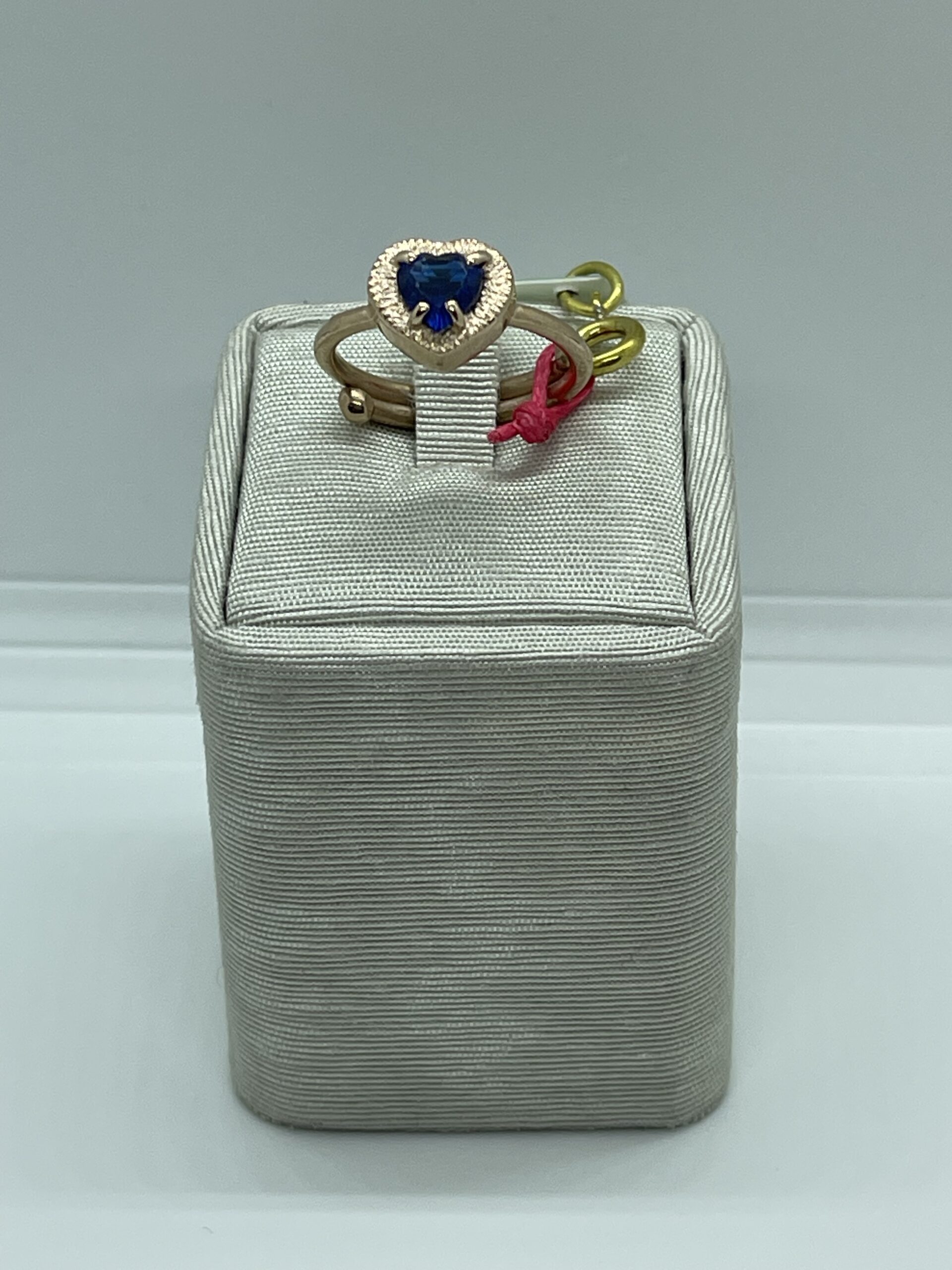 Anello in argento 925/°°° rose gold con pietra blu sintetica taglio cuore. Misura regolabile. Dimensioni pietra circa 0,5 cm. Realizzato a mano in Italia.