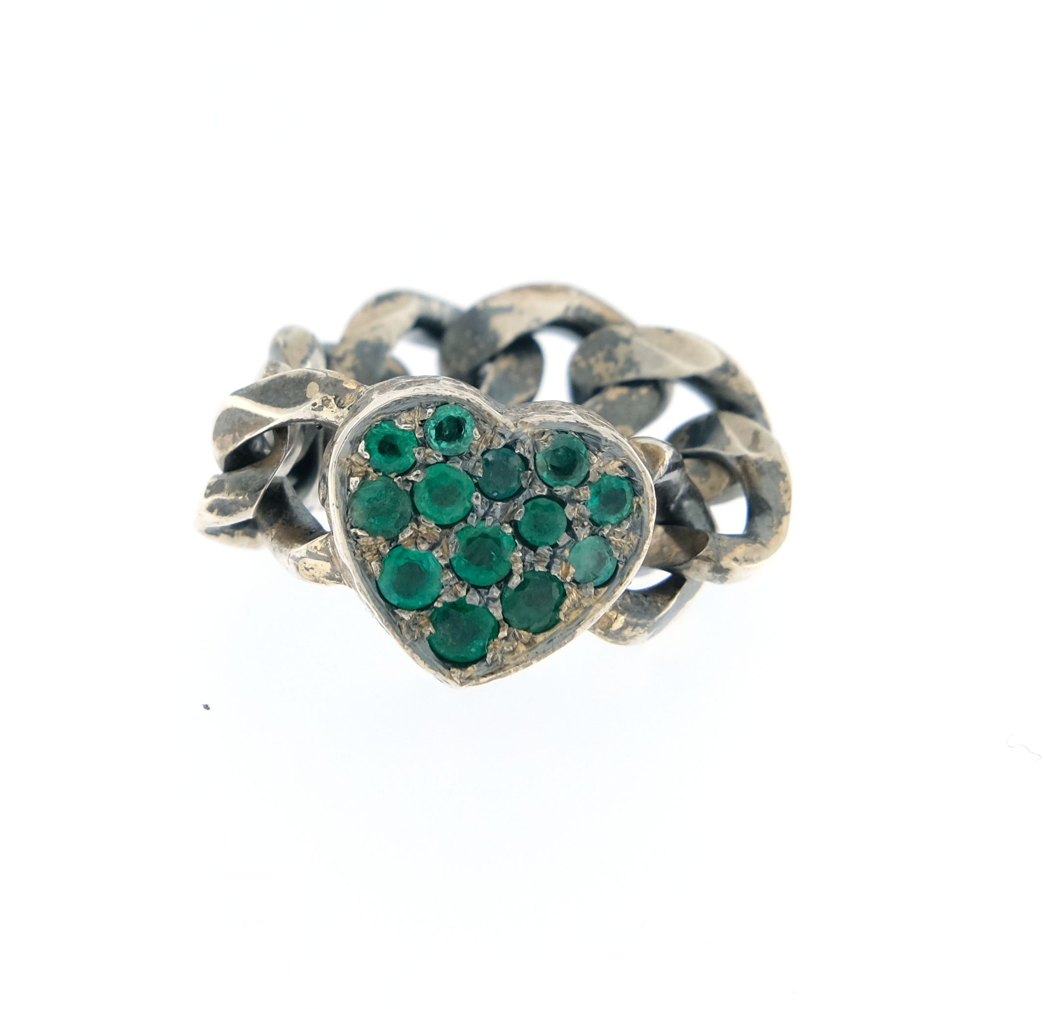 Anello in argento 925/°°° con maglia barbazzale morbida. Elemento centrale lavorazione martellata. Su ordinazione nelle versioni con radici di rubino, radici di smeraldo, e radici di zaffiro blu scuro. Realizzato a mano in Italia