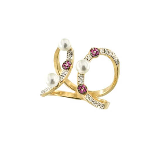 Anello in Argento 925/°°° placcatura oro giallo 18kt doppio contrariè con perle di conchiglia e zirconi. Misura Regolabile. Collezione Galactica