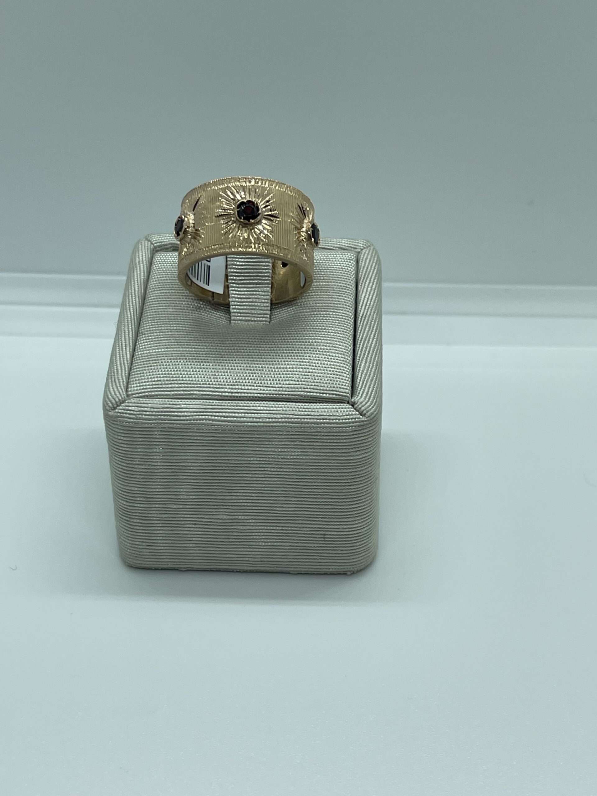 Anello fascia in argento rose 925/°°° con lavorazione tipo stile fiorentino. Con radici di rubino incassate a griffes. Misura regolabile da 14. Altezza fascia 11 mm. Realizzato a mano in Italia. Referenza AN3598