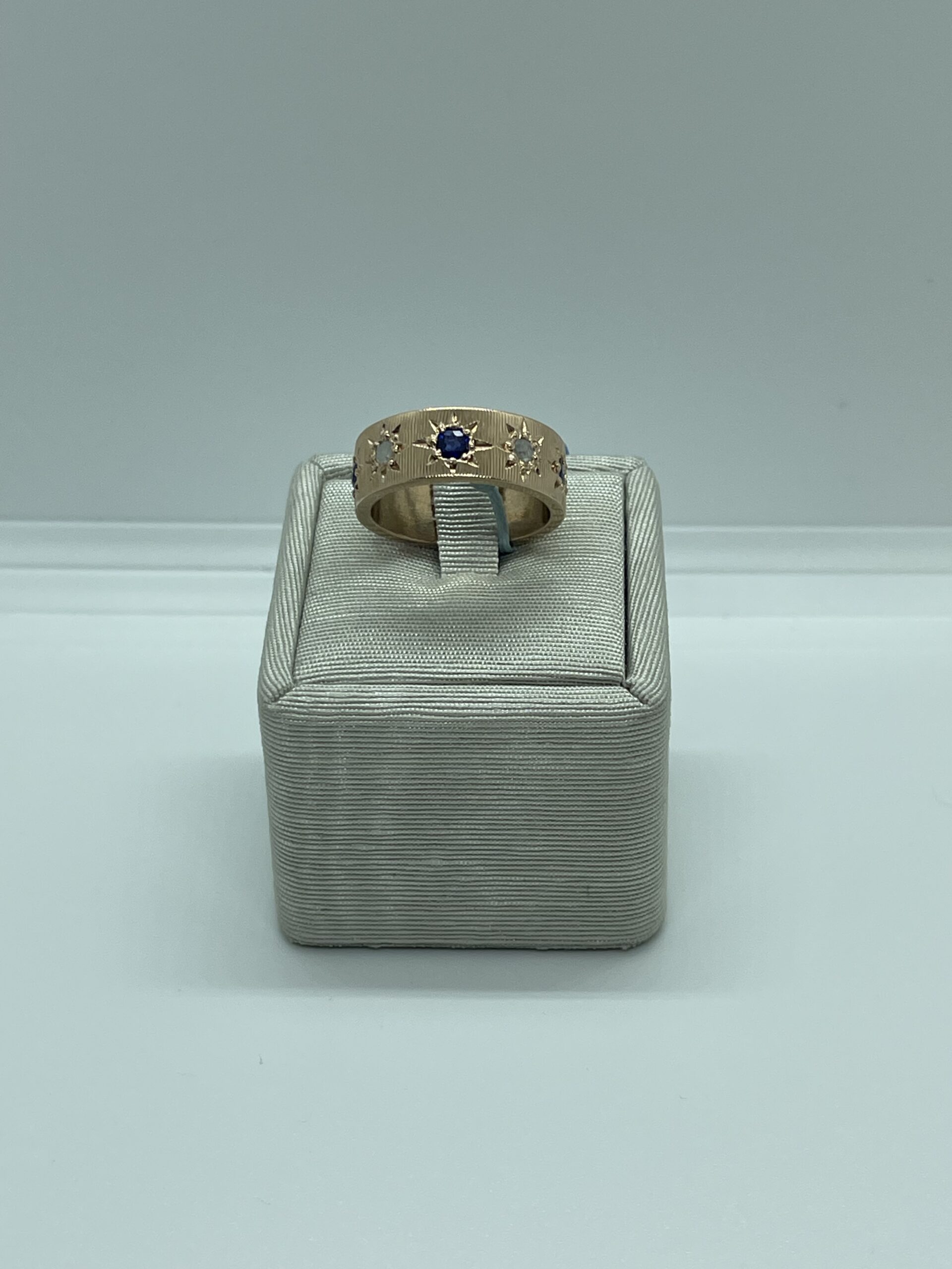 Anello fascia in argento rose 925/°°° con lavorazione tipo stile fiorentino. Con radici di zaffiro e rosette di diamanti incassate a griffes. Misura regolabile da 14. Altezza fascia 7 mm. Realizzato a mano in Italia. Referenza AN3876