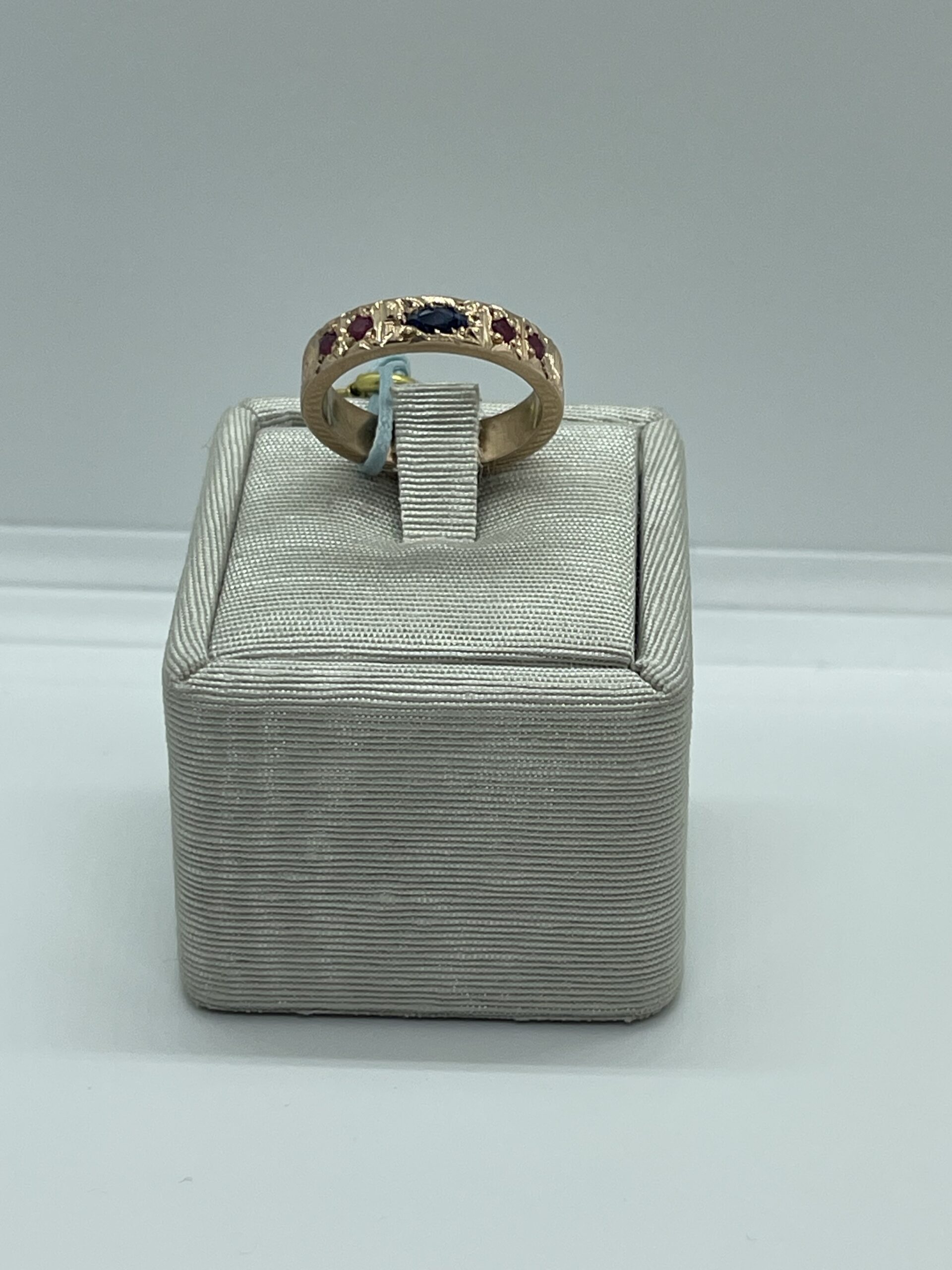 Anello fascia in argento rose 925/°°° con lavorazione tipo stile fiorentino. Con radice di zaffiro ovale e 4 radici di rubino incassate a griffes. Misura regolabile da 14. Altezza fascia 4 mm. Realizzato a mano in Italia. Referenza AN3880