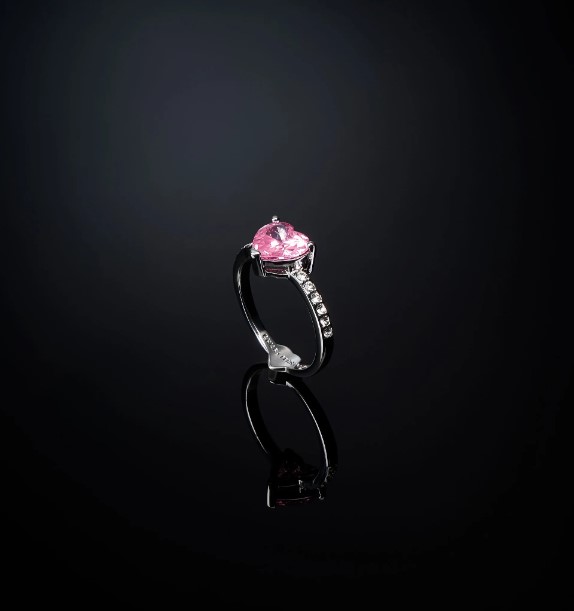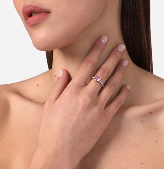 Anello Solitario della collezione Chiara Ferragni First Love. Colore: argento. Anello placcato rodio con zircone rosa taglio cuore centrale e zirconi bianchi sul gambo. Referenza J19AUV42