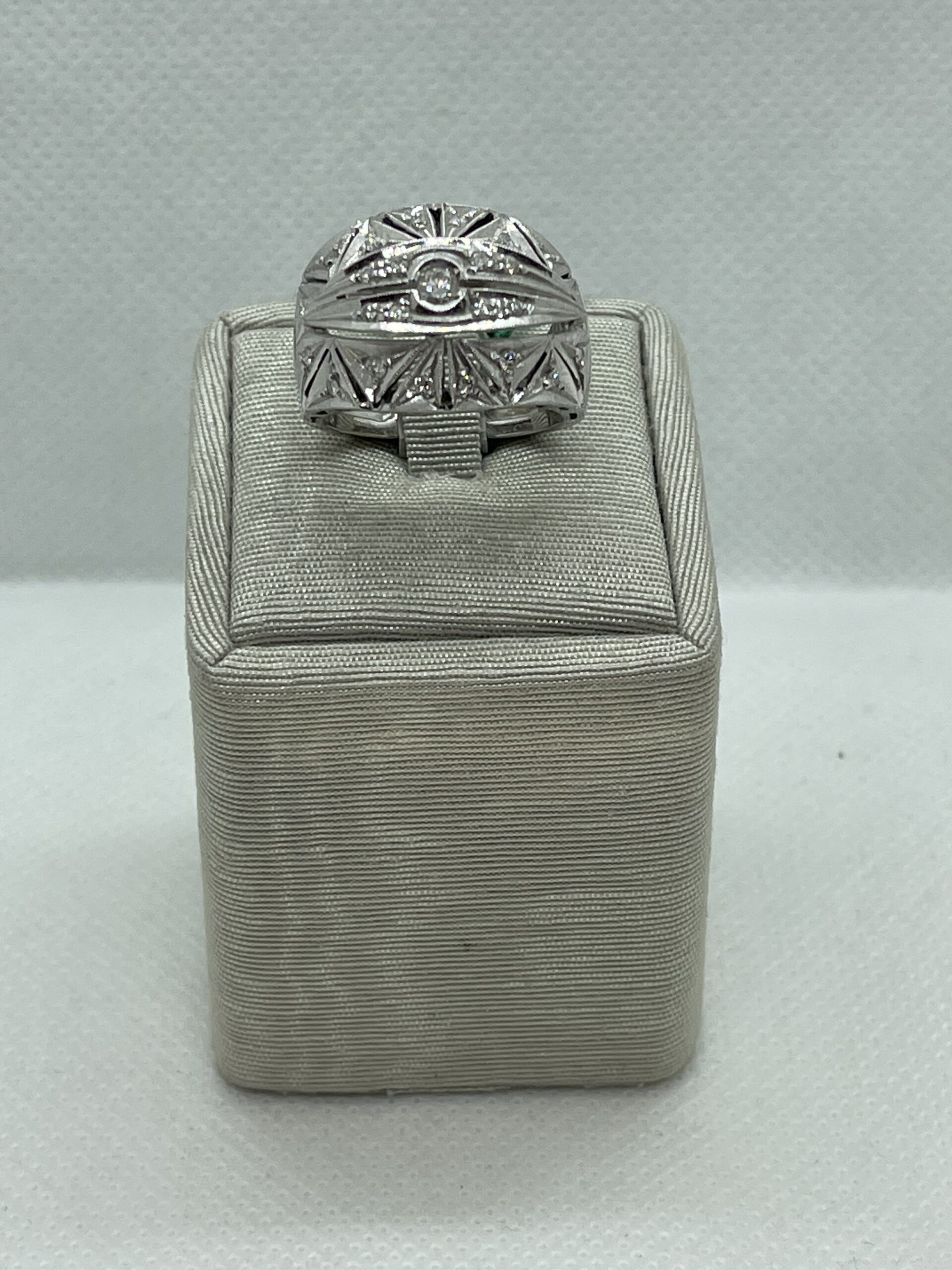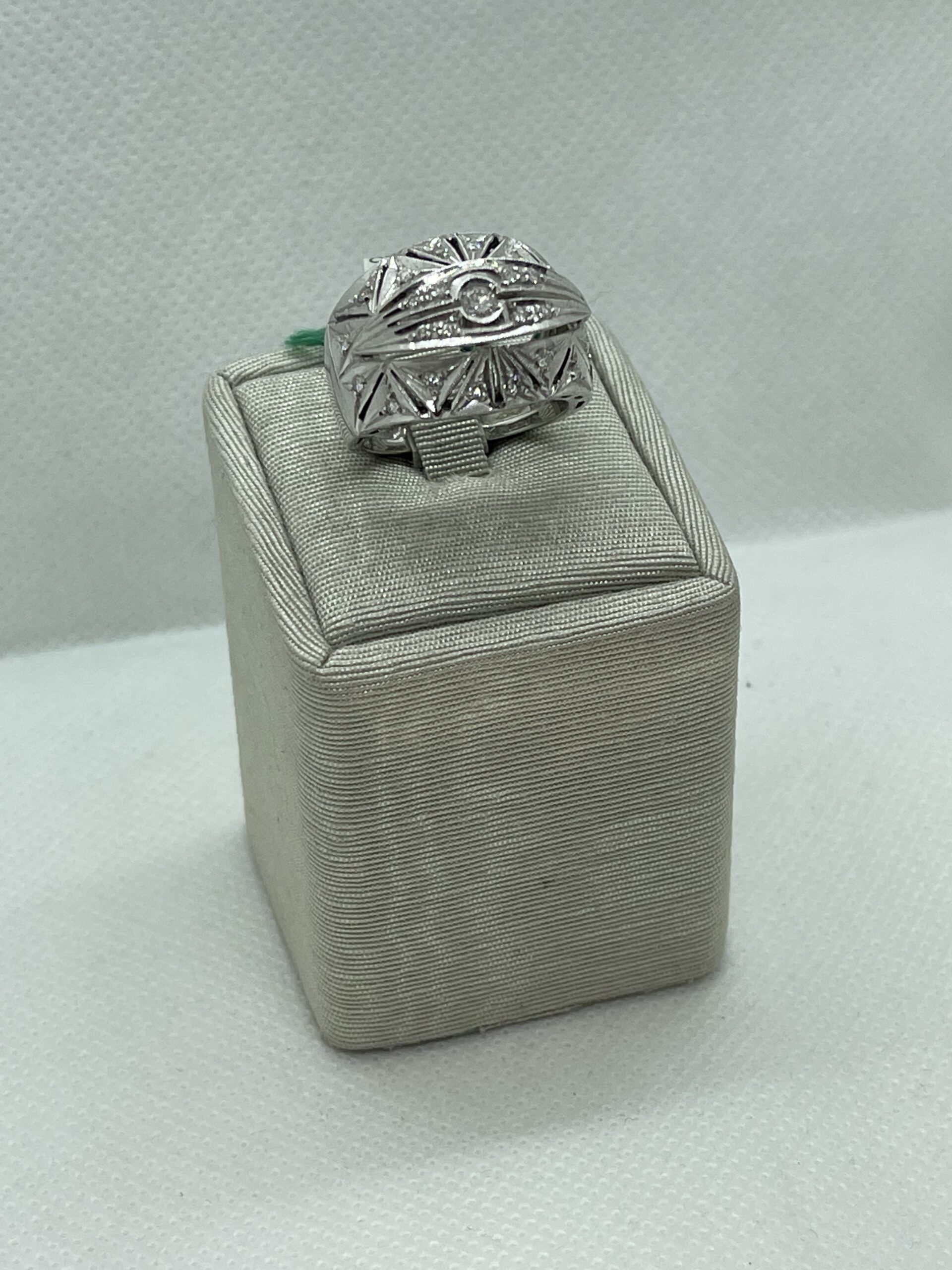 Anello in oro bianco 750/°°° con diamanti naturali taglio brillante incastonati in una texture dalla forma geometrica. 11 grammi. Caratura Diamanti 0,42. Realizzato a mano. Garanzia ufficiale Massari Gioielli