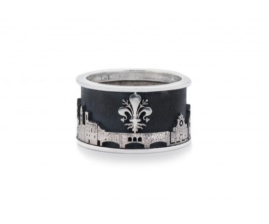 Anello fascia 12 millimetri in argento 925/°°° con skyline di Firenze su fondo brunito. Realizzato a mano. Made in Italy. Referenza AN1002