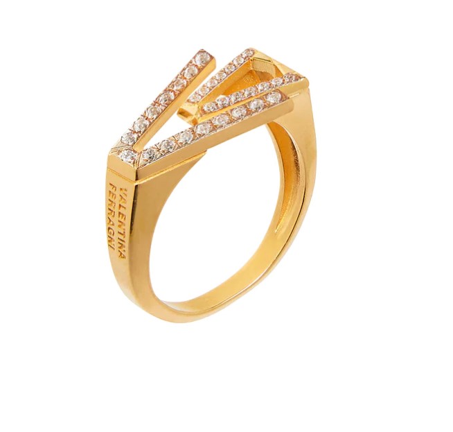 Anello in argento 925/°°° con placcatura in oro giallo e pavè di zirconi. Motivo doppia V.