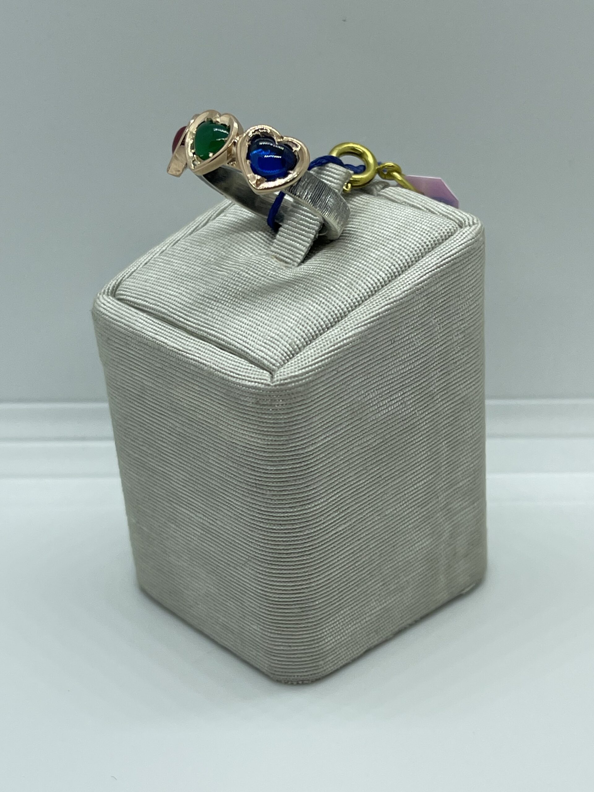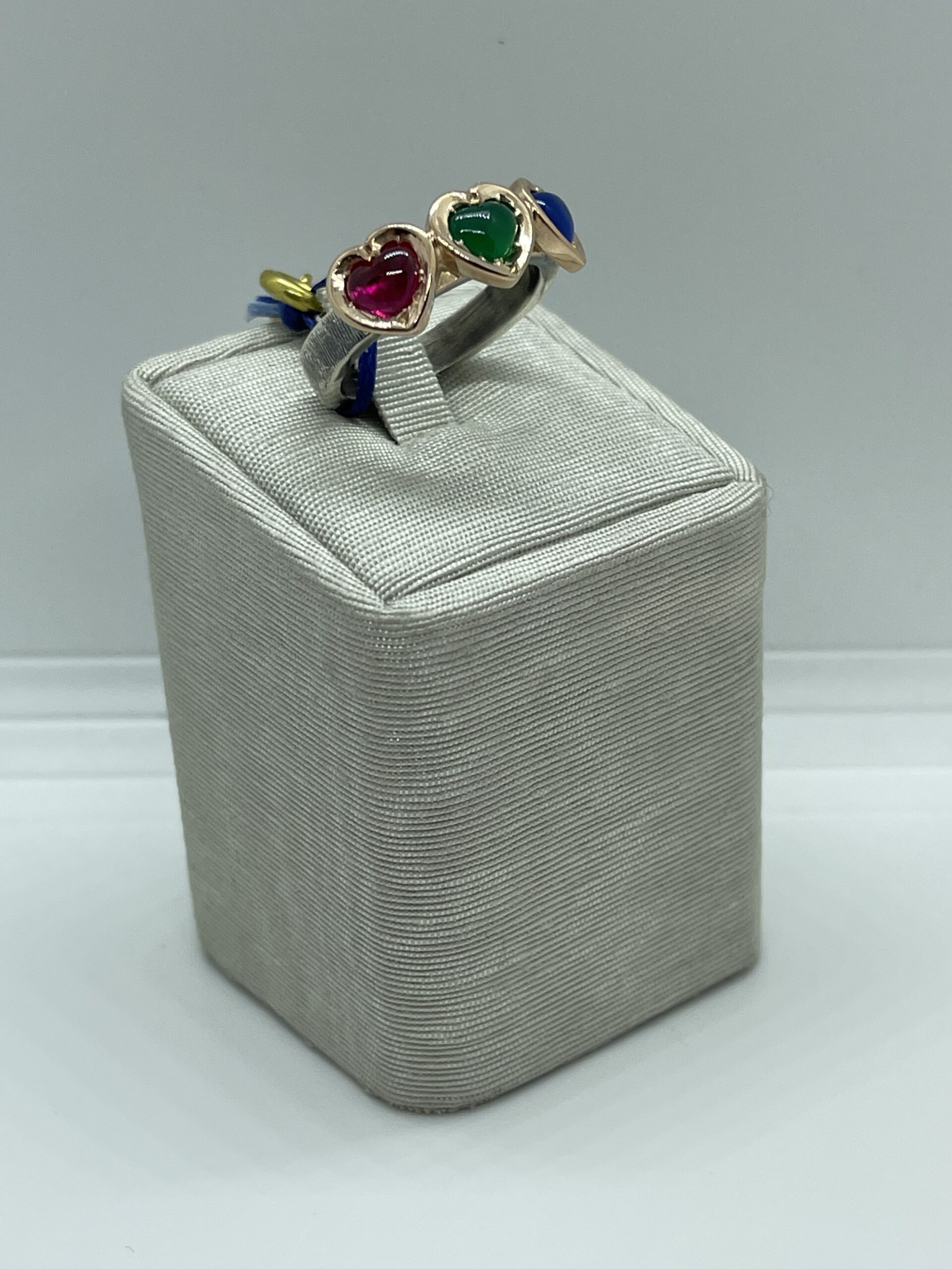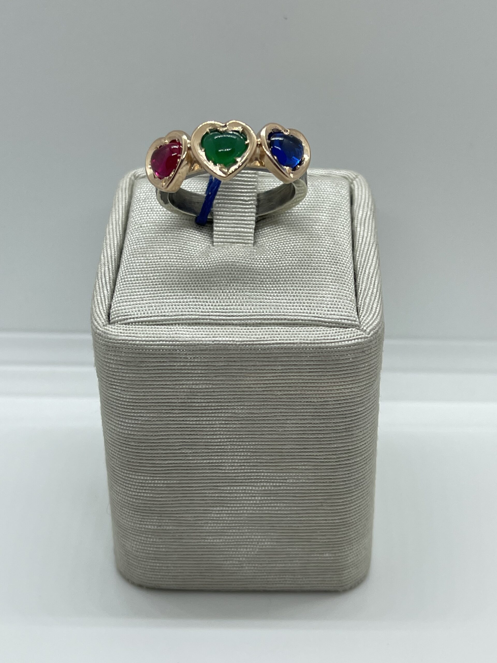 Anello in argento 925/°°° rose gold trilogy con pietra sintetiche colorate, blu rossa e verde. Gambo in argento brunito. Misura regolabile. Realizzato a mano in Italia.