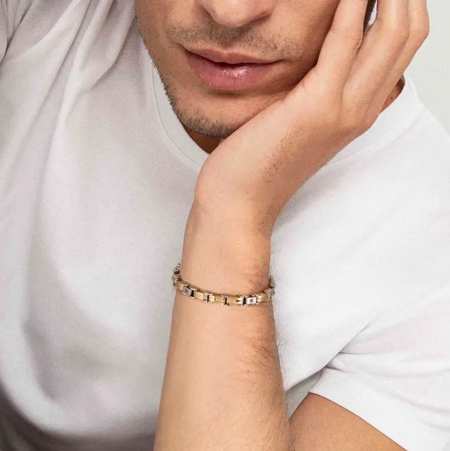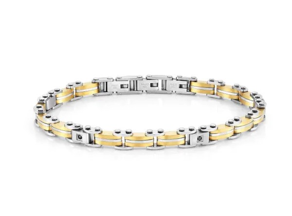Bracciale in acciaio 316/304 catena di bicicletta bicolore con diamanti neri. Altezza maglia 0,6 cm. Lunghezza 21 cm.