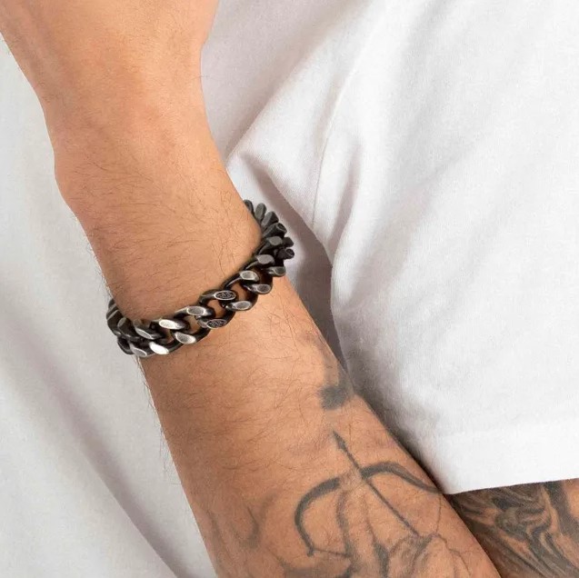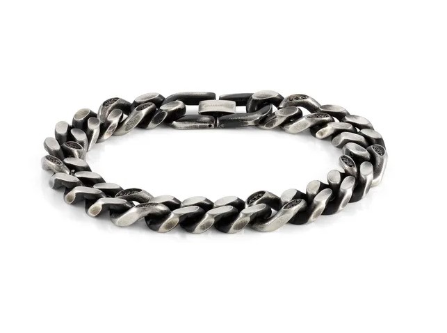 Bracciale in acciaio 316/304 con finitura PVD nero sfumato e cubic zirconia neri. Altezza maglia 1,1 cm. Lunghezza 20 cm. Ordinabile anche 22 cm e 24 cm
