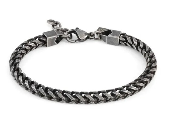 Bracciale in acciaio 316/304 maglia bizantina quadra pvd nero sfumato. Lunghezza da 19 a 22 cm regolabile con moschettone. Altezza maglia 0,5 cm.
