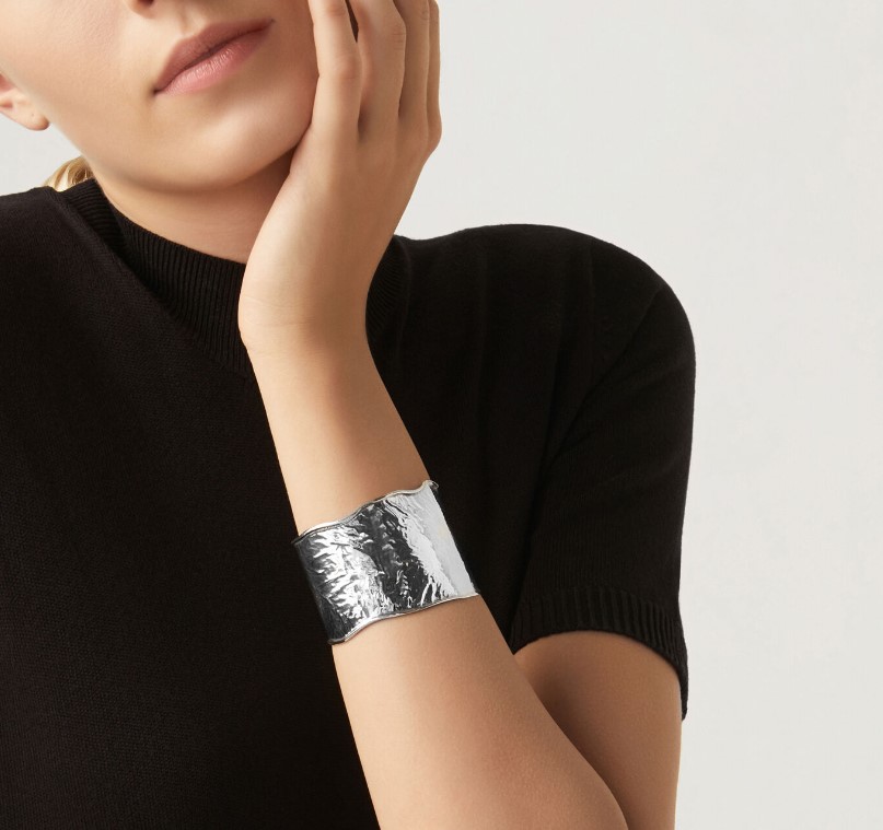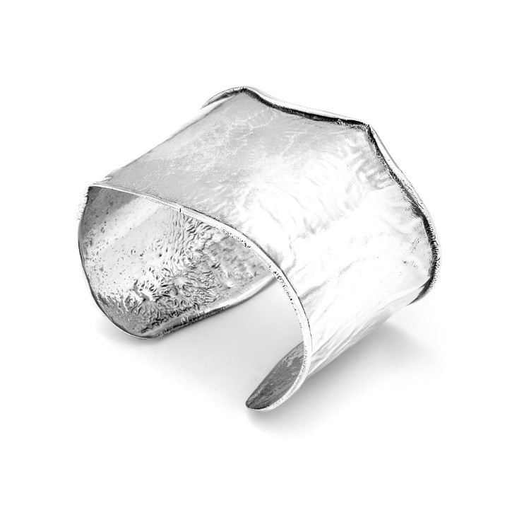 Bracciale schiava in argento 925/°°° della collezione Fuego, composto da una lastra con effetto increspato. Misura ovale interno 6,7×5. Altezza fascia 4,5 cm. Realizzato a mano in Italia. Referenza 10821