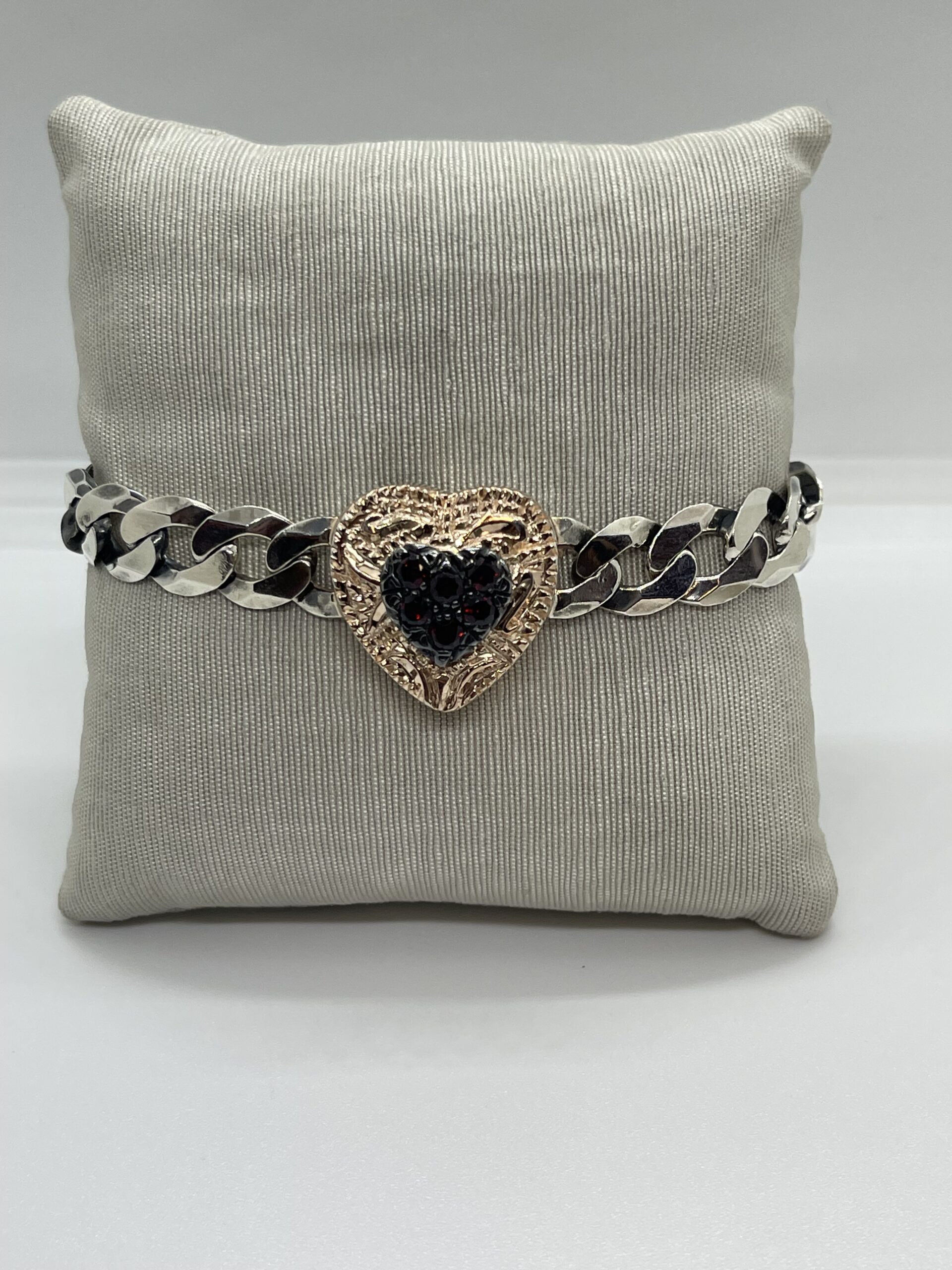 Bracciale maglia barbazzale in argento con cuore in argento rose gold e granati. Lunghezza 17,5 cm. Referenza BR3798