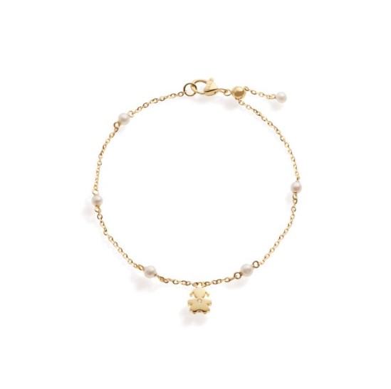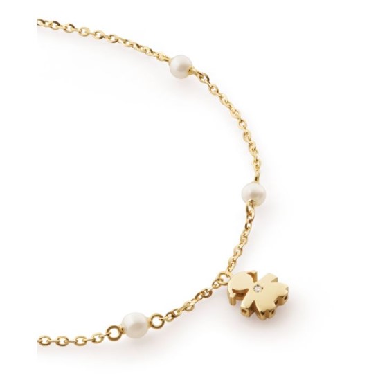 Bracciale in oro giallo 9kt con perle diametro 3-3,5 e brillantino sulla sagoma. Lunghezza 18-20 cm regolabile. Chiusura moschettone. Collezione Le Perle. Referenza LBB833
