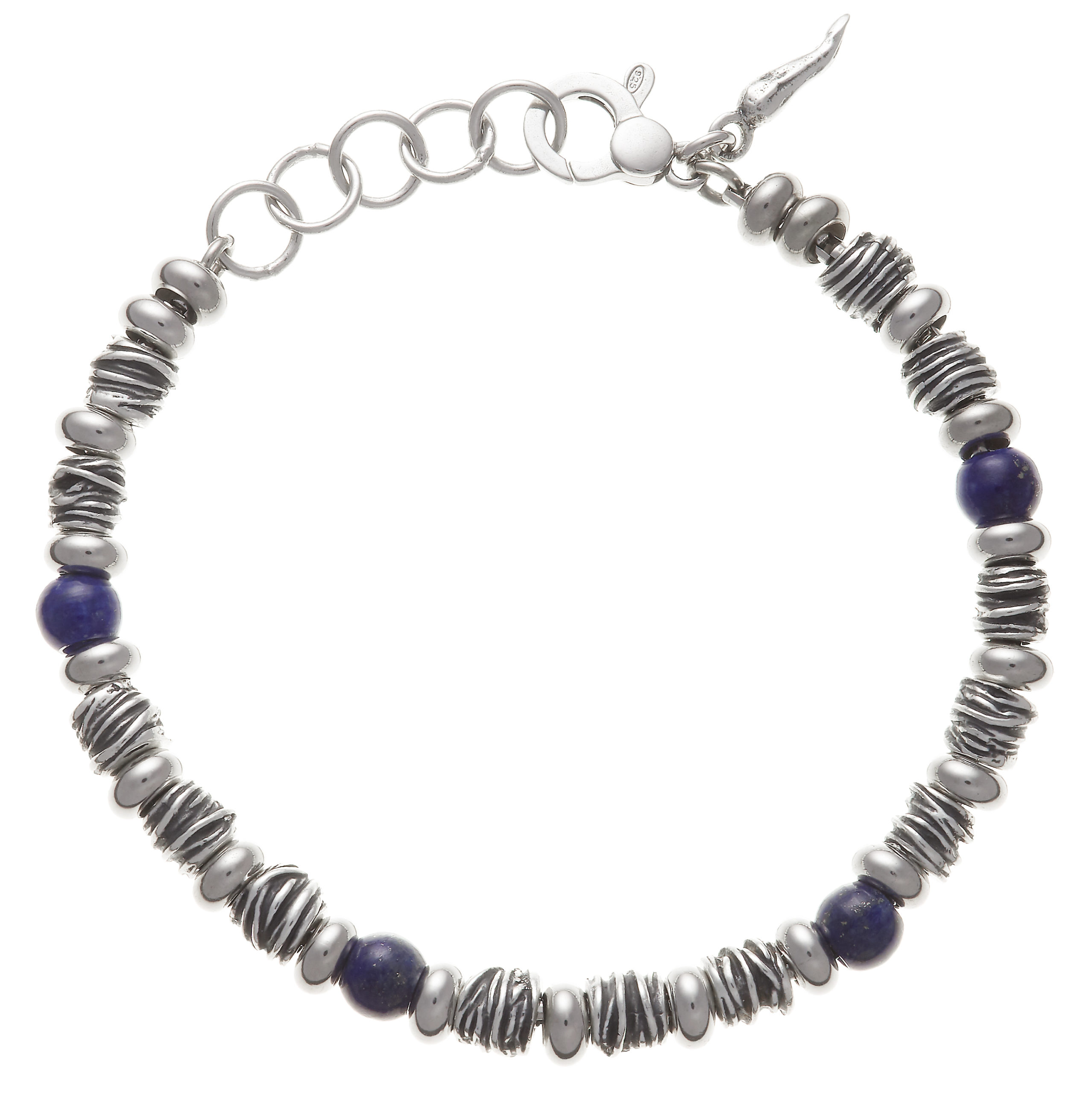Bracciale in argento 925/°°° con nodi alternati a ciambelline e lapislazzuli. Chiusura con moschettone e maglie di regolazione. Lunghezza 20 cm. Realizzato a mano in Italia. Referenza 10695