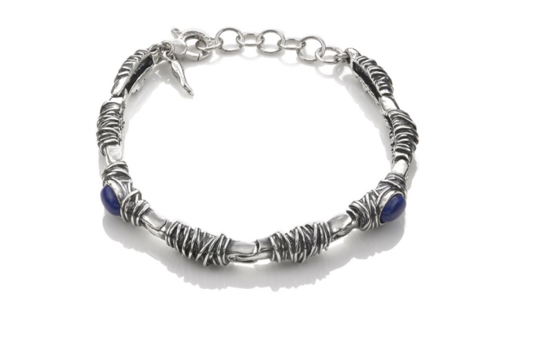 Bracciale in argento 925/°°° con nodi e lapislazzuli ovali. Chiusura con moschettone e maglie di regolazione. Lunghezza 20 cm. Realizzato a mano in Italia. Referenza 10697