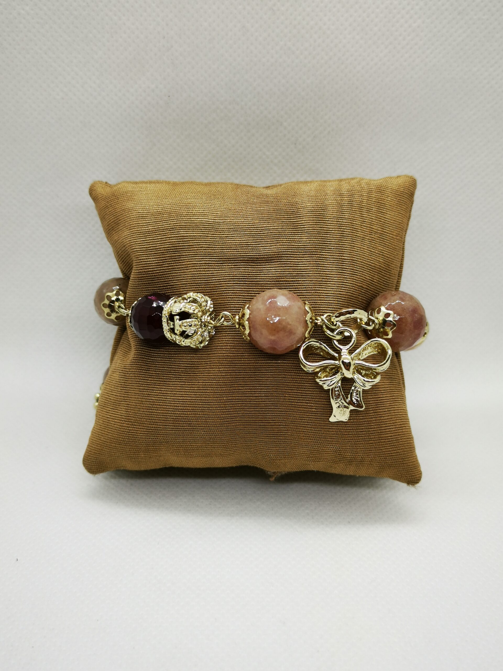 Bracciale in argento miele 925/°°° con boule rosa antico e borgogna. Lungo il bracciale elementi decorativi, corona fiore e fiocco. Lunghezza regolabile da 19 a 21 cm.