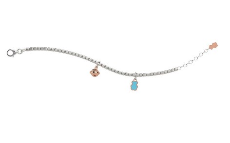 Bracciale a dadini bimbo in argento 925/°°° con campanella ed orsetto celeste. Misura regolabile. Chiusura con moschettone. Referenza NAN0250