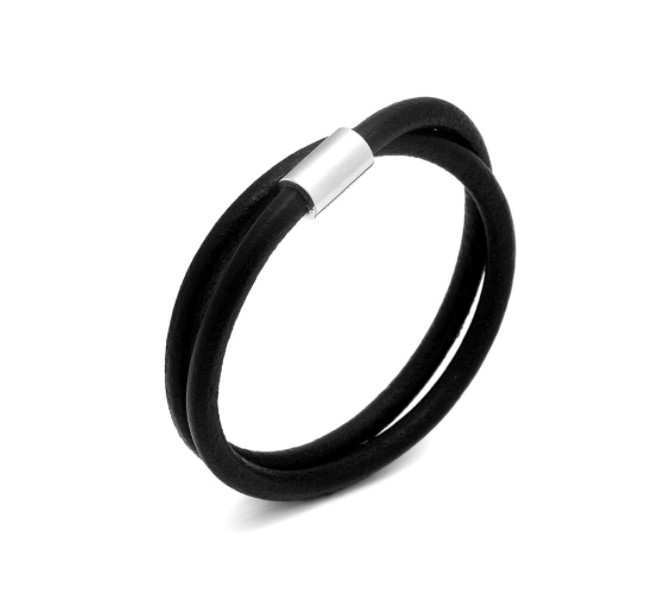 Bracciale 42 cm indossabile anche come collana in cuoio nero. Chiusura in argento 925/°°° con calamita
