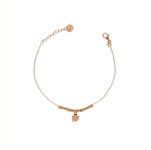 Bracciale in argento 925/°°° placcato oro rosa 18kt con quadrifoglio pendente e ciambelline. Misura regolabile 15,5 + 3 cm con catenina. Chiusura moschettone. Collezione I sogni son Desideri