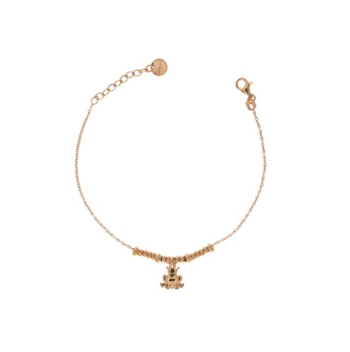 Bracciale in argento 925/°°° placcato oro rosa 18kt con principe ranocchio pendente e ciambelline. Misura regolabile 15,5 + 3 cm con catenina. Chiusura moschettone. Collezione I sogni son Desideri