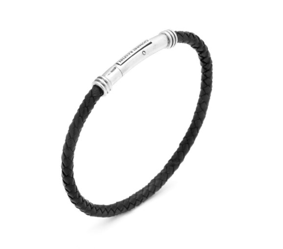 Bracciale in cuoio nero intrecciato, lunghezza 21 cm, con chiusura in argento 925/°°° con calamita. Realizzato a mano in Italia. Referenza 11354