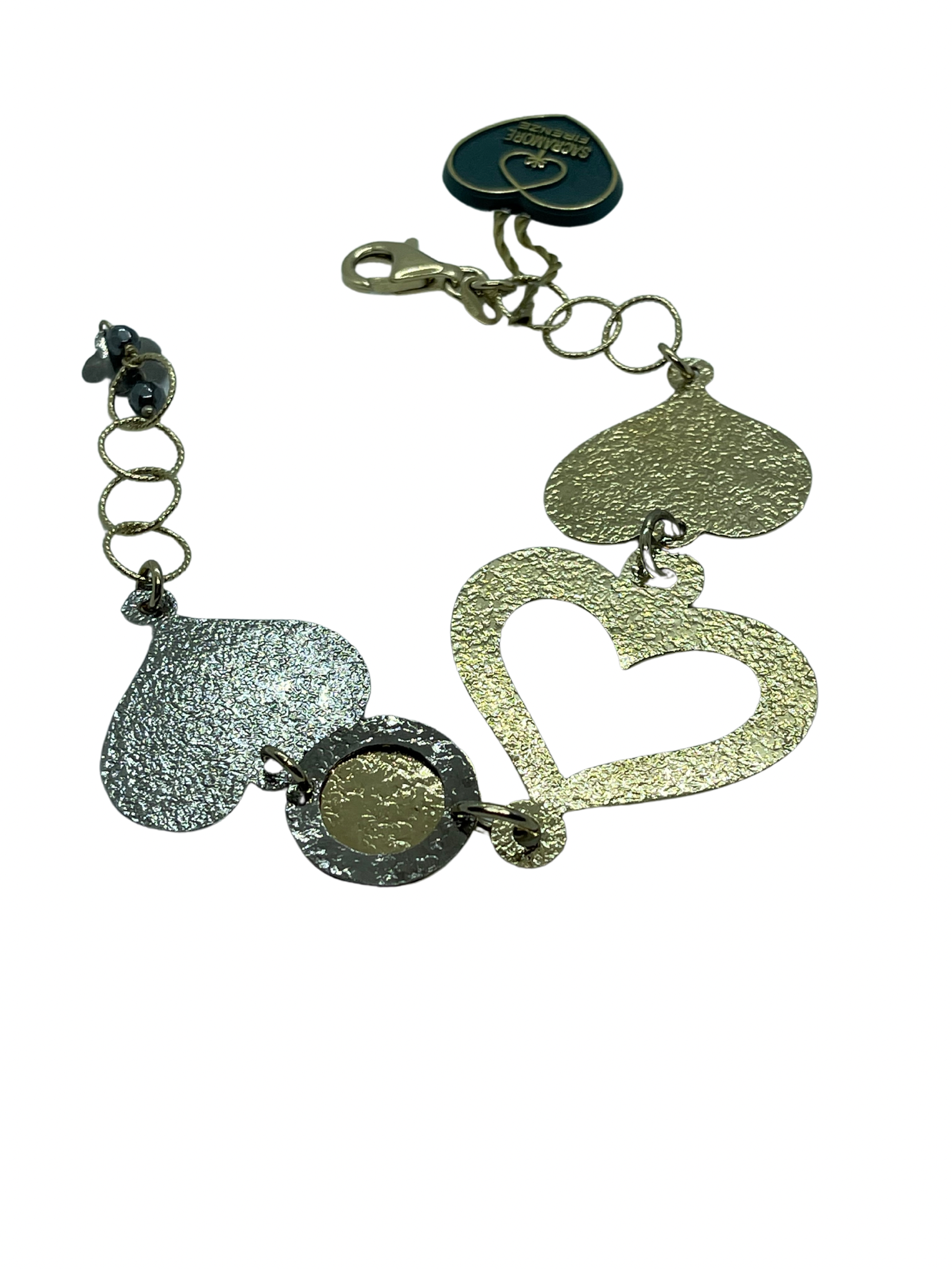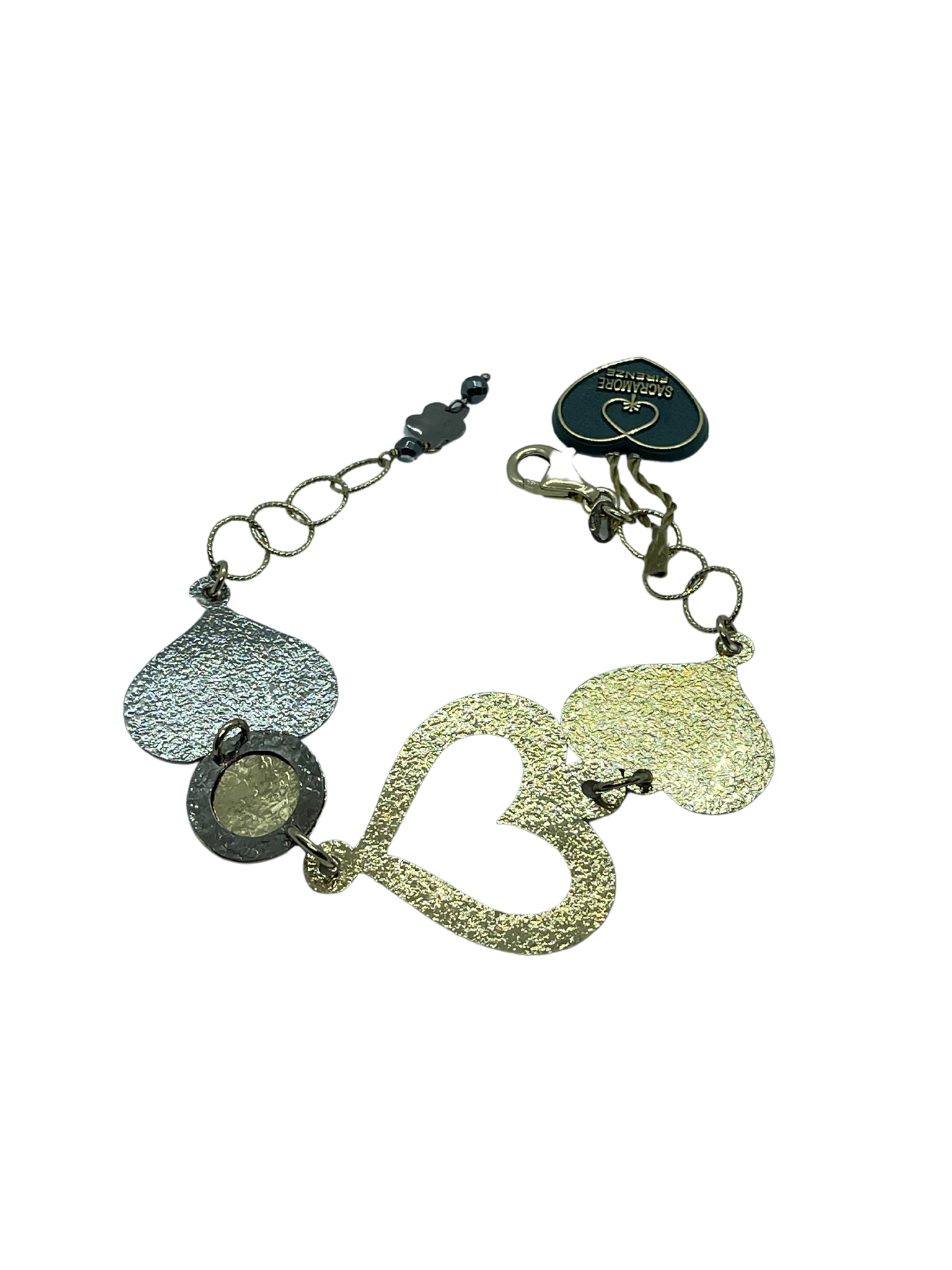 Bracciale in argento 925 color miele con cuori grandi martellati. Lunghezza massima 20 cm regolabile. Realizzato a mano in Italia