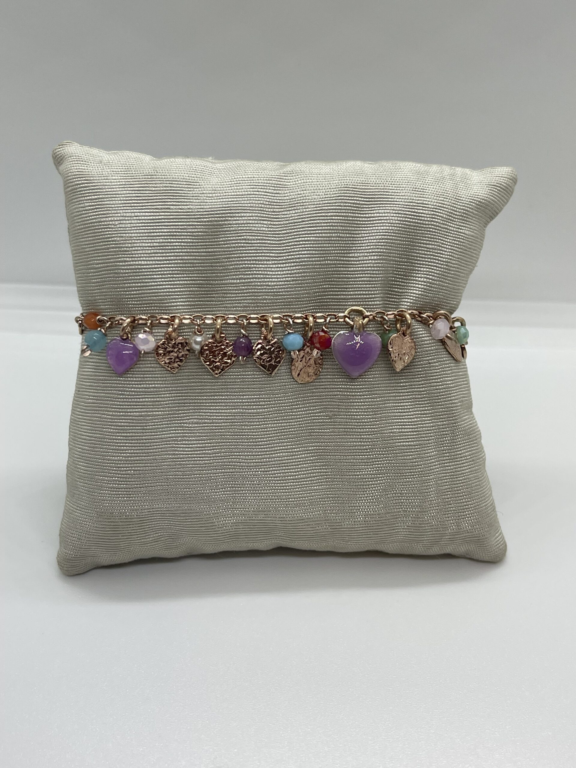 Bracciale in argento rose gold con cuoricini martellati pendenti e cuoricini smalto lilla. Lunghezza regolabile 15-16 cm. Referenza BR3890