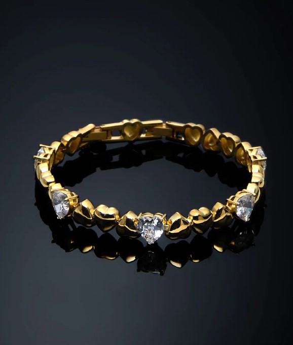 Bracciale semirigida in metallo gold placcato oro della collezione cuoricino. Lunghezza complessiva 17 cm. Con 5 zirconi taglio cuore 7×7 millimetri. Referenza J19AVT09
