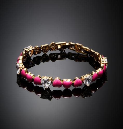 Bracciale in metallo placcato oro giallo 18kt con cuoricini smalto rosa e zirconi taglio cuore. Misura 16 cm con estensione. Referenza J19AWD07