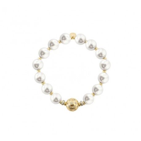 Bracciale elastico in argento 925/°°° placcato oro giallo 18kt con sfera centrale tempestata di zirconi e perle di conchiglia. Collezione Starball