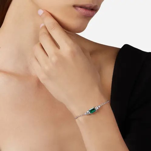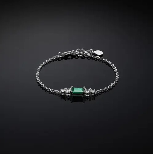 Bracciale in metallo placcato rodio, lunghezza 16 cm + 3 regolabile cm con 4 zirconi bianchi laterali e zircone verde taglio smeraldo centrale. Chiusura con moschettone. Referenza J19AWJ20