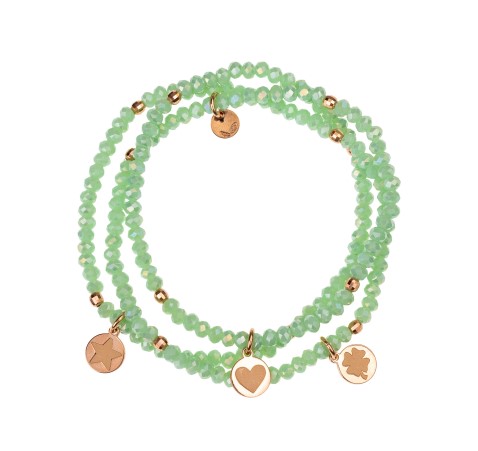Bracciale elastico in argento 925/°°° placcato oro rosa 18kt con pendenti vari e palline color acquamarina. Indossabile come girocollo di 17 cm oppure bracciale 3 giri. Collezione Gipsy Chic