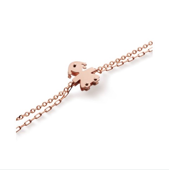 Bracciale in oro rosa 750/°°° a doppia catenina con sagoma bimba e diamantino sul moschettone. Lunghezza regolabile da 16 a 19 cm. Altezza sagoma 1 cm, larghezza sagoma 0,9 cm. Collezione I Mini. Referenza LBB525