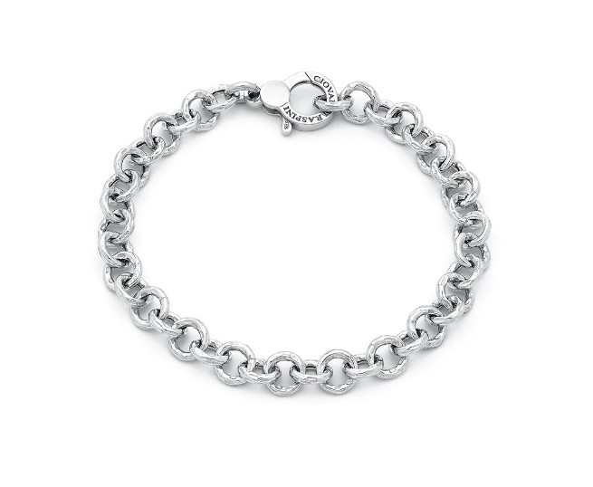 Bracciale in argento 925/°°° catena con maglie martellate. Chiusura con moschettone, lunghezza 20 cm. Realizzato a mano in Italia. Referenza 11605