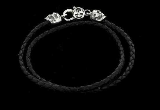 Bracciale con cordino in cuoio intrecciato in argento 925/°°° con teschi sui finali e moschettone rifinito artigianalmente. Interamente realizzato a mano in Italia.