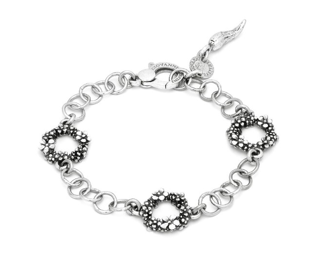 Bracciale in argento 925/°°° della collezione Millefiori con cerchi floreali. Chiusura con moschettone. Realizzato a mano in Italia. Lunghezza 19 cm regolabile con moschettone. Referenza 11700