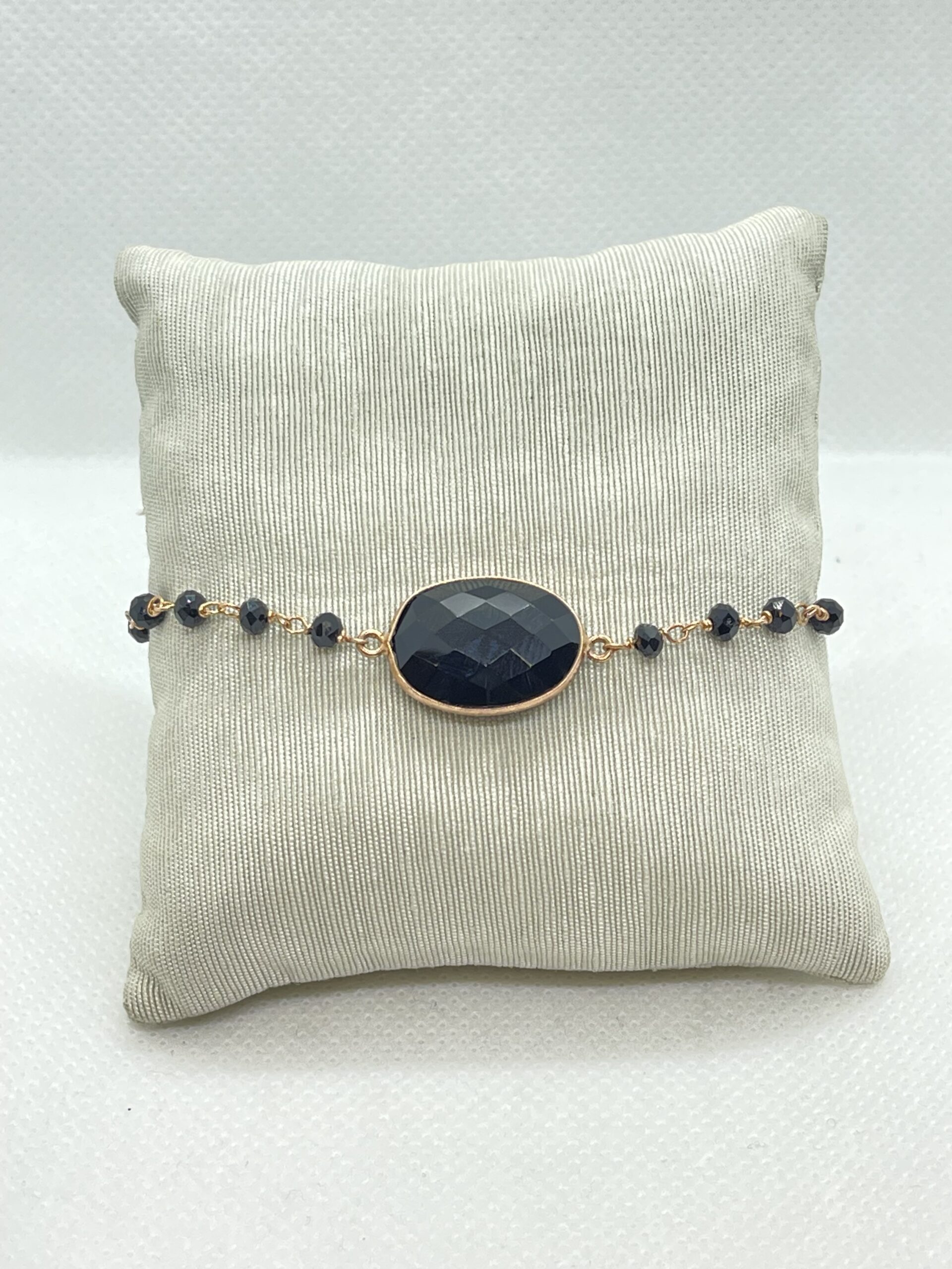 Bracciale in argento rose 925/°°° con spinelli neri e pietra nera sfaccettata al centro. Lunghezza regolabile da 18 a 20 cm. Realizzato a mano.