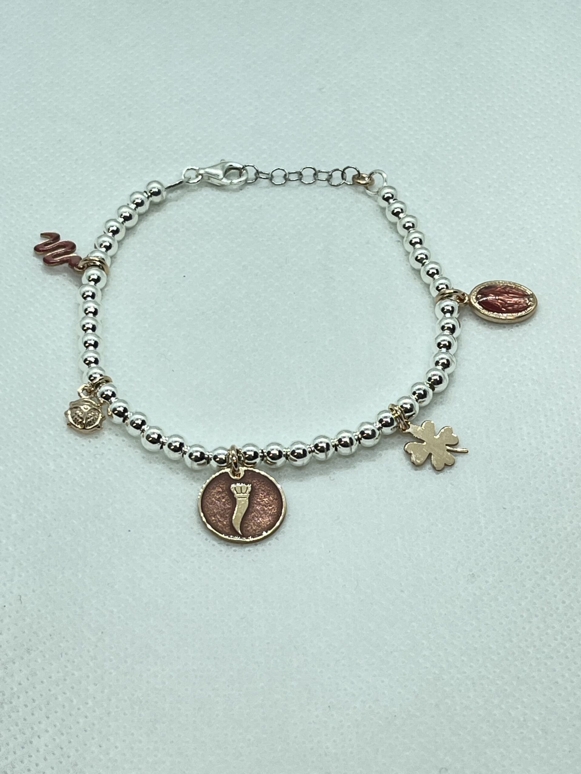 Bracciale in argento 925/°°° con palline e ciondoli vari colorati tema fortuna. Chiusura con moschettone. Realizzata in Italia.