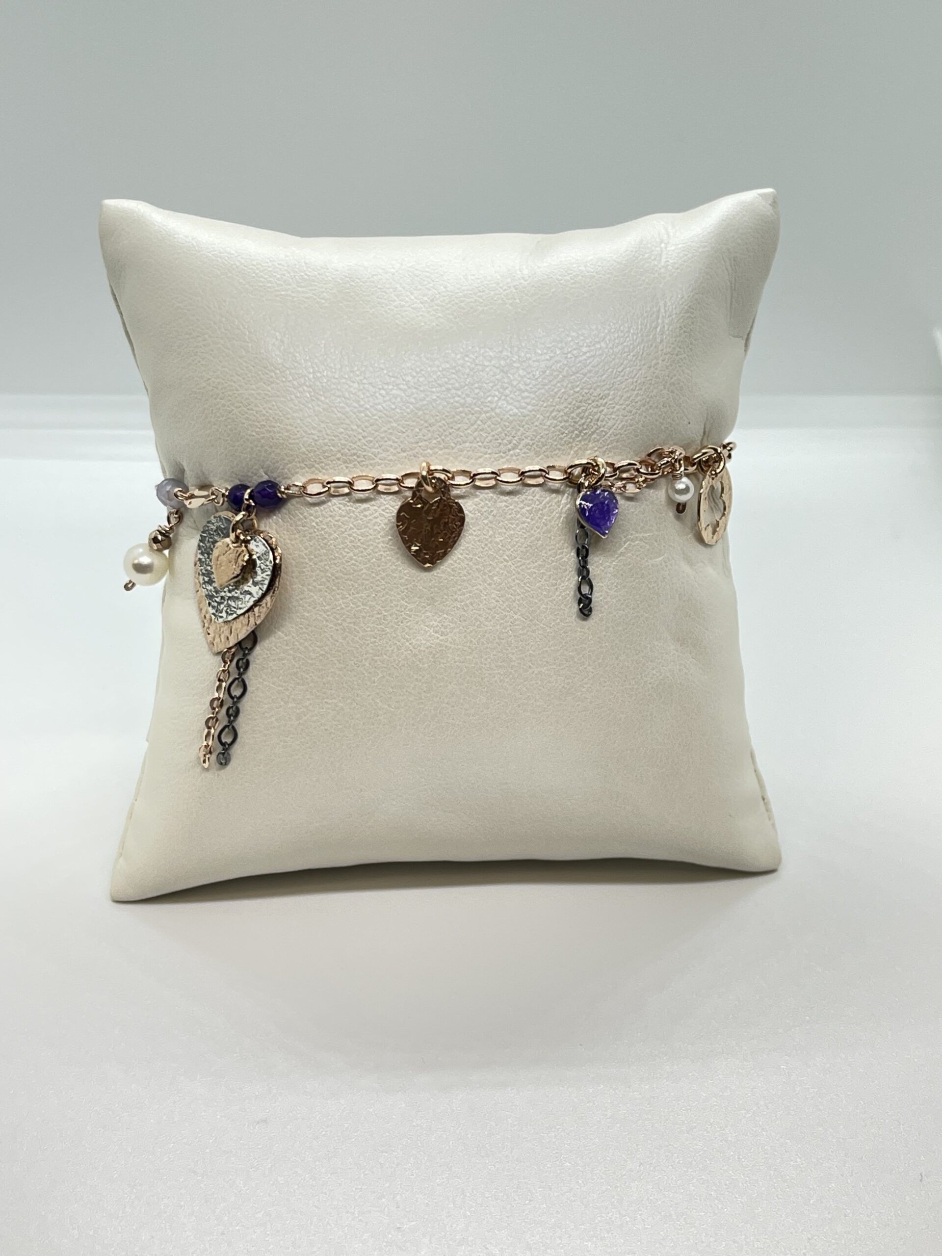 Bracciale in argento rose 925/°°° con cuori pendenti e smalto viola. Lunghezza regolabile da 16 a 18 cm. Chiusura con moschettone. Realizzato a mano in Italia. Referenza BR3632/3
