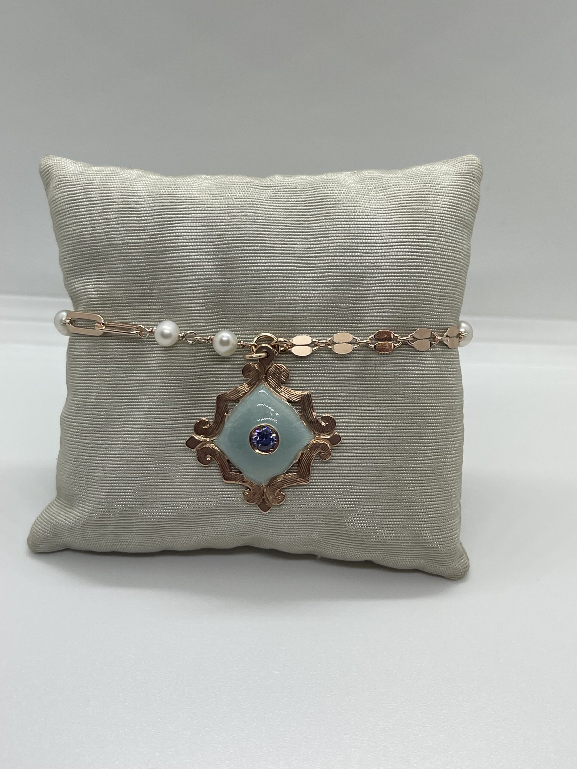 Bracciale in argento rose gold con perline di fiume e pendente con smalto celeste. Lunghezza regolabile 15-17 cm. Referenza BR1457