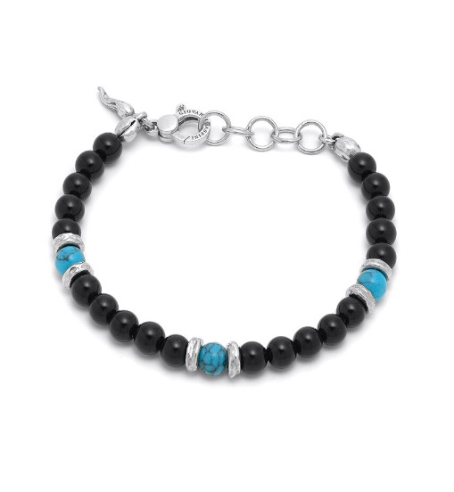 Bracciale in argento 925/°°° con onice e howlite turchese. Chiusura con moschettone, lunghezza 21 cm regolabile. Realizzato a mano in Italia. Referenza 11651