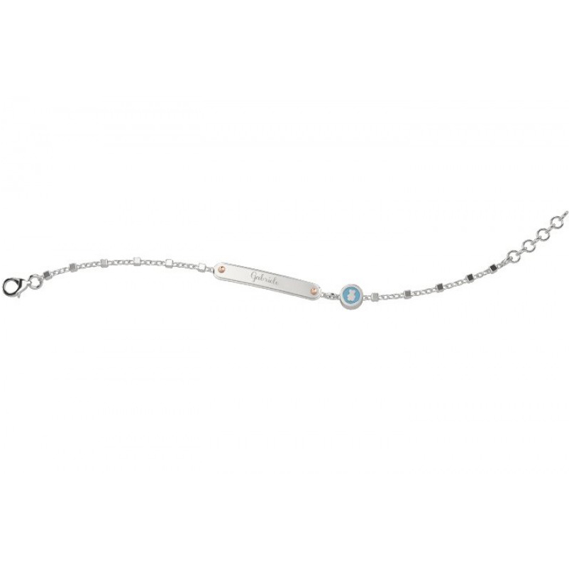 Bracciale bimbo in argento 925/°°° con targhetta e pepita smaltata azzurra con orsetto. Referenza NAN0108.