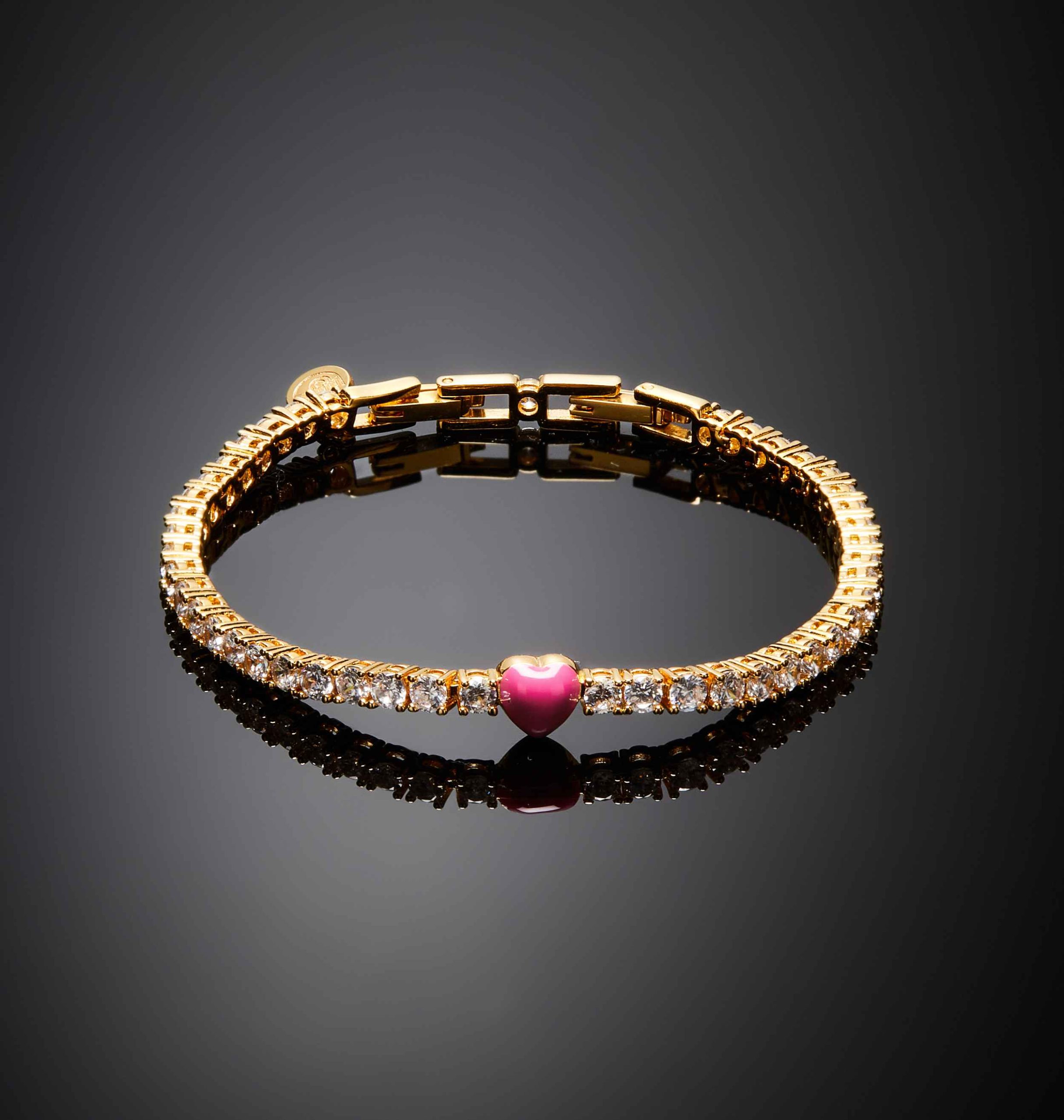 Bracciale tennis in metallo placcato oro giallo 18kt con zirconi e cuoricino smalto rosa. Misura 16 cm con estensione. Referenza J19AWD08