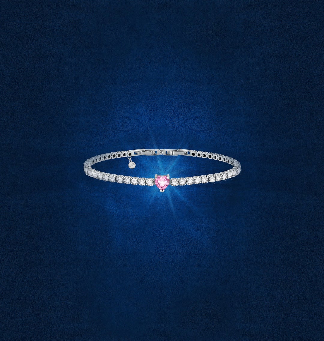 Bracciale tennis con zirconi, con zircone taglio cuore rosa al centro. Lunghezza regolabile 16 cm + 1,5 in metallo placcato rodio della collezione First Love. Referenza J19AUV13