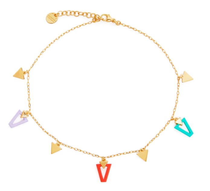 Cavigliera in argento 925 placcato oro giallo con elementi pendenti e smalti vari colori. Lunghezza 24 cm regolabile chiusura con moschettone.