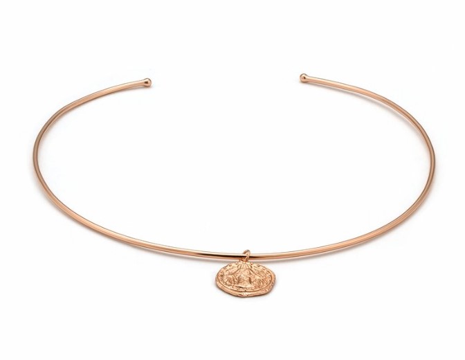 Collana rigida girocollo in argento 925/°°° placcato oro rosa con moneta pendente.