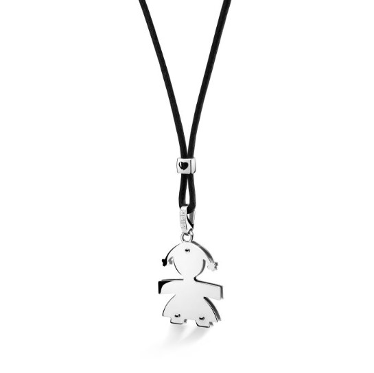 Ciondolo bimba in oro bianco 9kt corredato di cordino nero con distanziatore. Altezza 1,90 cm. Larghezza 1,70 cm. Collezione I Mini. Referenza LBB004-N