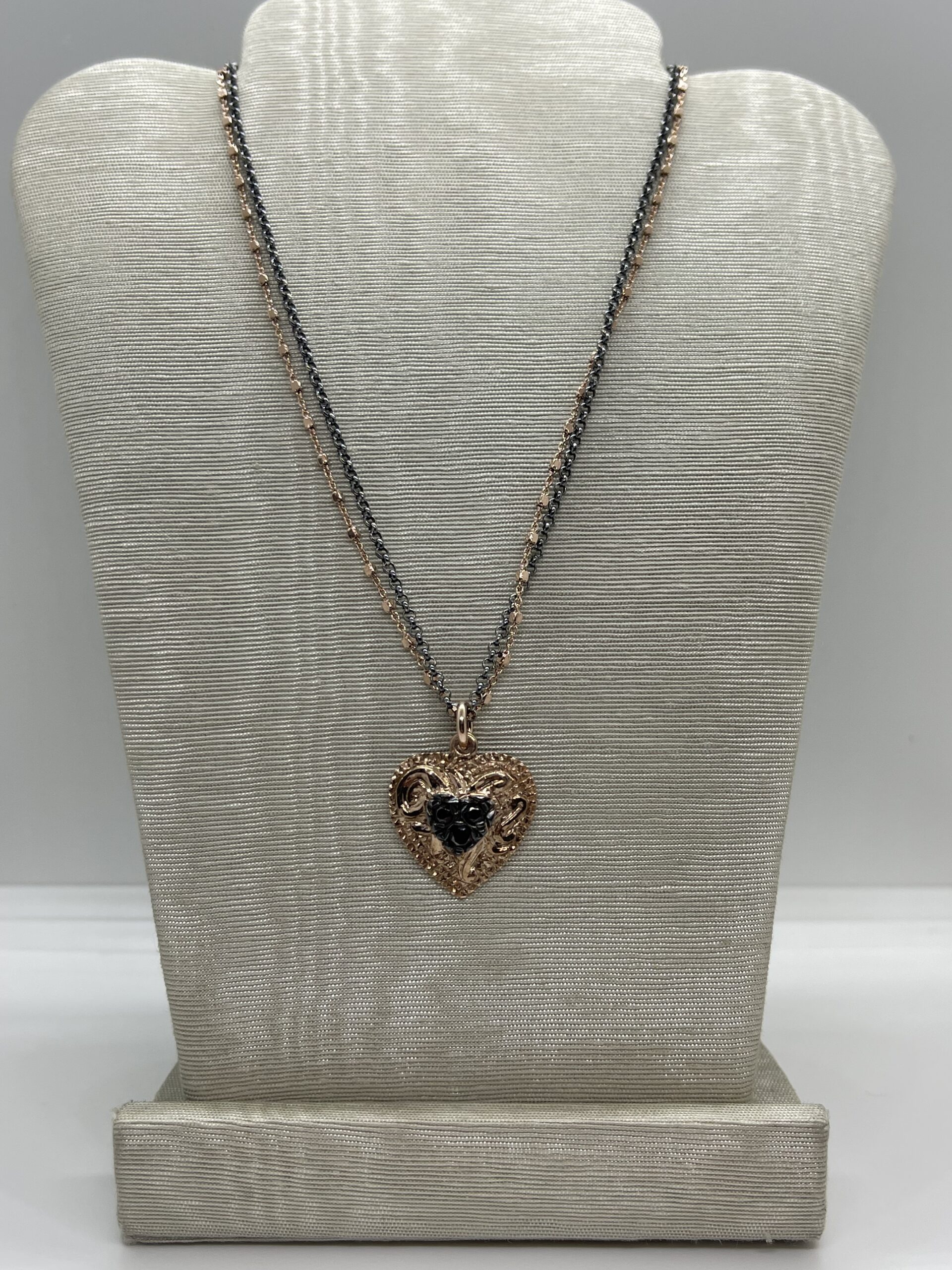 Girocollo in argento 925/°°° 2 fili uno rose gold ed uno brunito con cuore pendente rose gold intarsiato e granati al centro. Lunghezza da 39 a 43 cm regolabile. Chiusura con moschettone. Realizzato a mano in Italia. Referenza CL3796